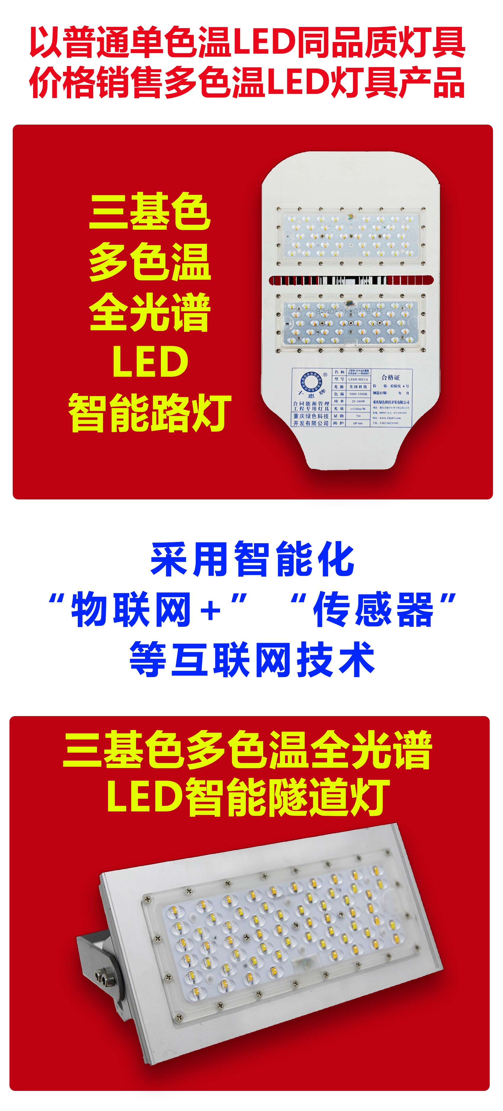 重慶“中國(guó)創(chuàng)造”三基色多色溫全光譜LED人工智能路燈技術(shù)是世界城市路燈照明領(lǐng)域淘汰普通單色溫LED路燈的先進(jìn)制造技術(shù),市場(chǎng)前景巨大。為了進(jìn)一步開(kāi)拓多色溫LED智能路燈照明市場(chǎng),重慶綠色科技開(kāi)發(fā)(集團(tuán))有限公司(以下簡(jiǎn)稱我司)擬尋覓誠(chéng)實(shí)守信、具有實(shí)力的LED電源制造公司、LED路燈燈具制造公司合作,整合資源優(yōu)勢(shì),免費(fèi)開(kāi)放多色溫全光譜LED智能路燈、智能終端控制器制造技術(shù),在合作期間免費(fèi)提供國(guó)家級(jí)“智慧城市”城市照明夜景燈飾四級(jí)考評(píng)管理共享平臺(tái)使用,通過(guò)技術(shù)共享,實(shí)現(xiàn)共同對(duì)外銷售,達(dá)到雙贏的目的,請(qǐng)有意合作者與我們聯(lián)系……